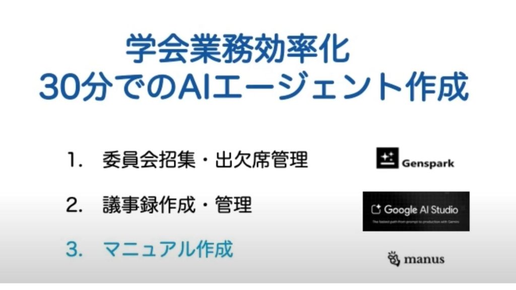 マニュアル作成AIエージェント AIを無料で作って即活用! たった30分で学会事務局AIを作成!