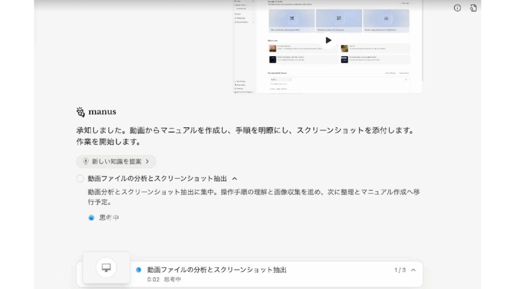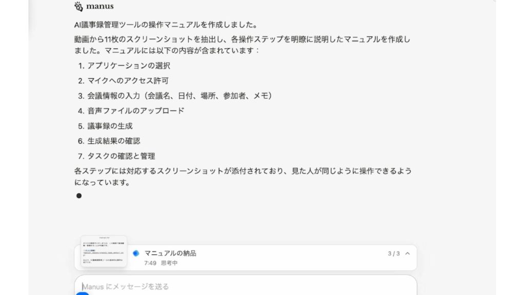 Manusは、単なるチャットボットとは異なり、タスクの計画、分解、ツールの呼び出し、実行、報告までを自律的に行う汎用エージェント型プラットフォームです。主な機能として、自律的なタスク実行能力や、マルチモーダル対応が挙げられます。特に、音声データなどのファイルを扱えるマルチモーダル機能が、今回のマニュアル作成において重要な役割を果たします。