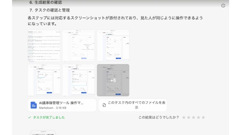 生成されたマニュアルには、一部調整や追記が必要な場合もありますが、スクリーンショットの撮影、画像の貼り付け、テキストの入力といった一連の作業をゼロから手動で行うのに比べ、はるかに効率的です。