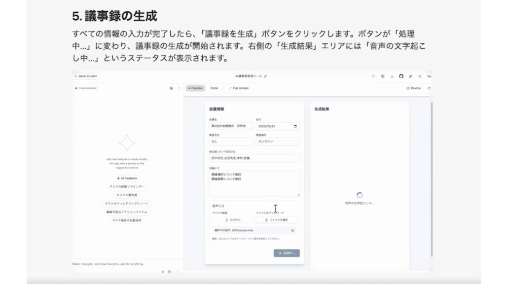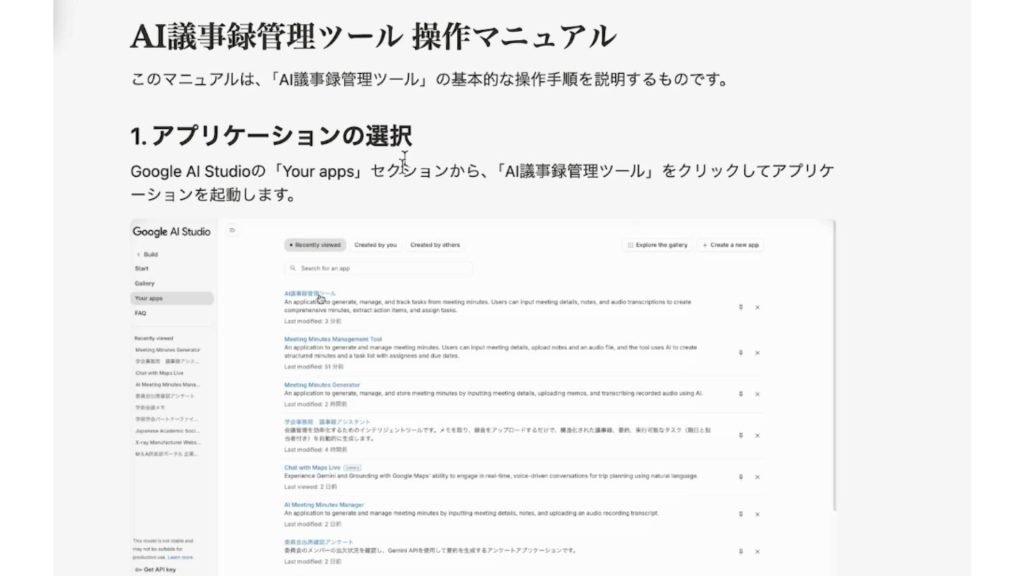 今回は、前回作成した「議事録作成AIエージェント」の操作方法を、説明を加えながら録画した動画を事前に用意しました。この動画を基に、AIにマニュアルを作成させます。