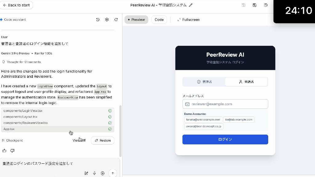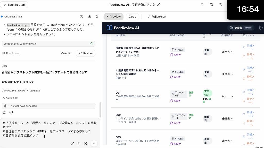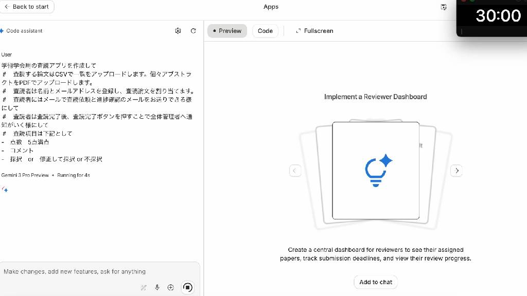 約30分のタイマーをスタートさせ、AIが構築を開始。すぐに初期バージョンが完成し、論文一覧のアップロード、査読者登録、割り当て機能などが実装されました。