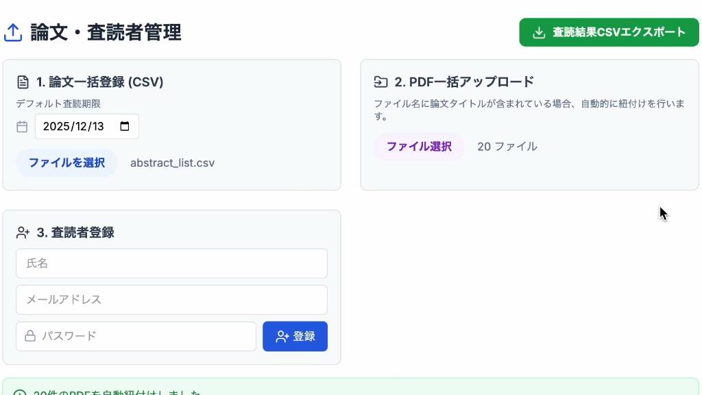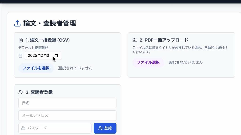 CSVデータとPDFデータをアップロードし査読者を登録します。
