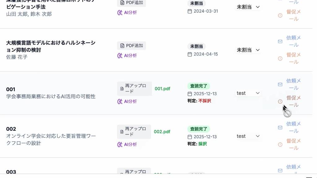 学会では査読者の割当、依頼メール送信、進捗管理、結果の取りまとめなど多くの作業を手作業で行っていることが多いのではないでしょうか。