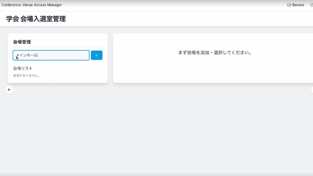 •会場管理機能:複数の会場(例:メインホール、A会場、B会場)を登録し、管理対象の会場を選択できます。