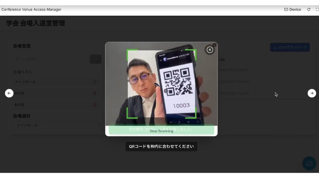 •QRコード読み取り:カメラを起動し、参加者のQRコード(スマートフォンや名札)を読み取って入退室を記録します。