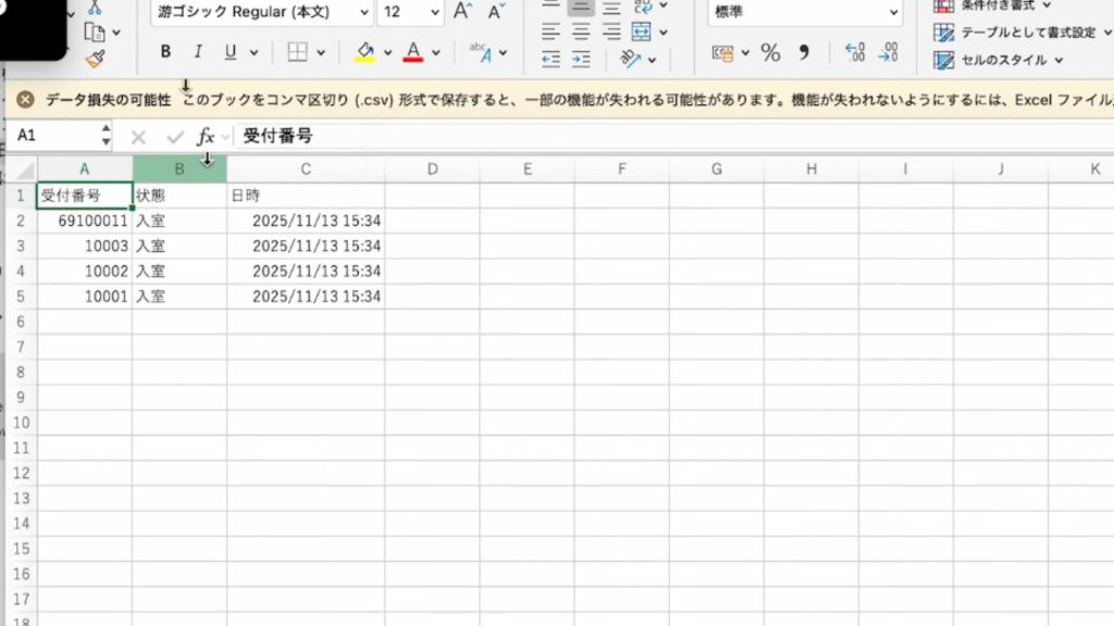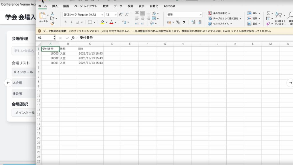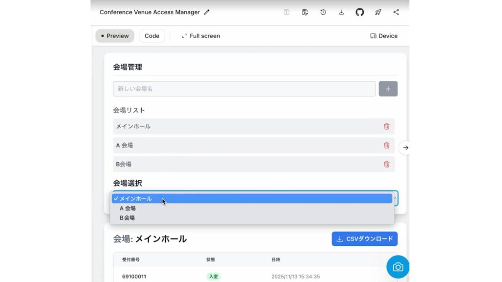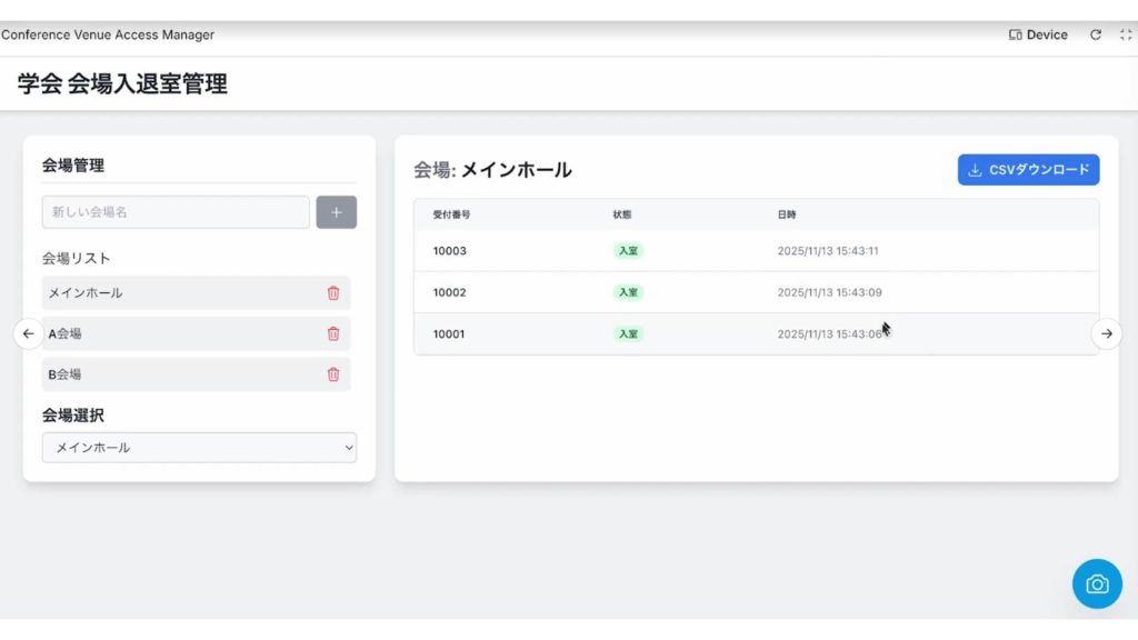 修正後、入室から5分以内の再スキャンでは退室が記録されなくなり、意図した通りの入退室管理が可能になりました。また、CSVダウンロードボタンが追加され、会場ごとの記録をエクスポートできるようになりました。