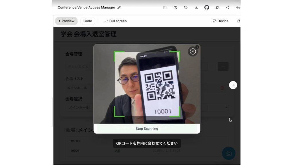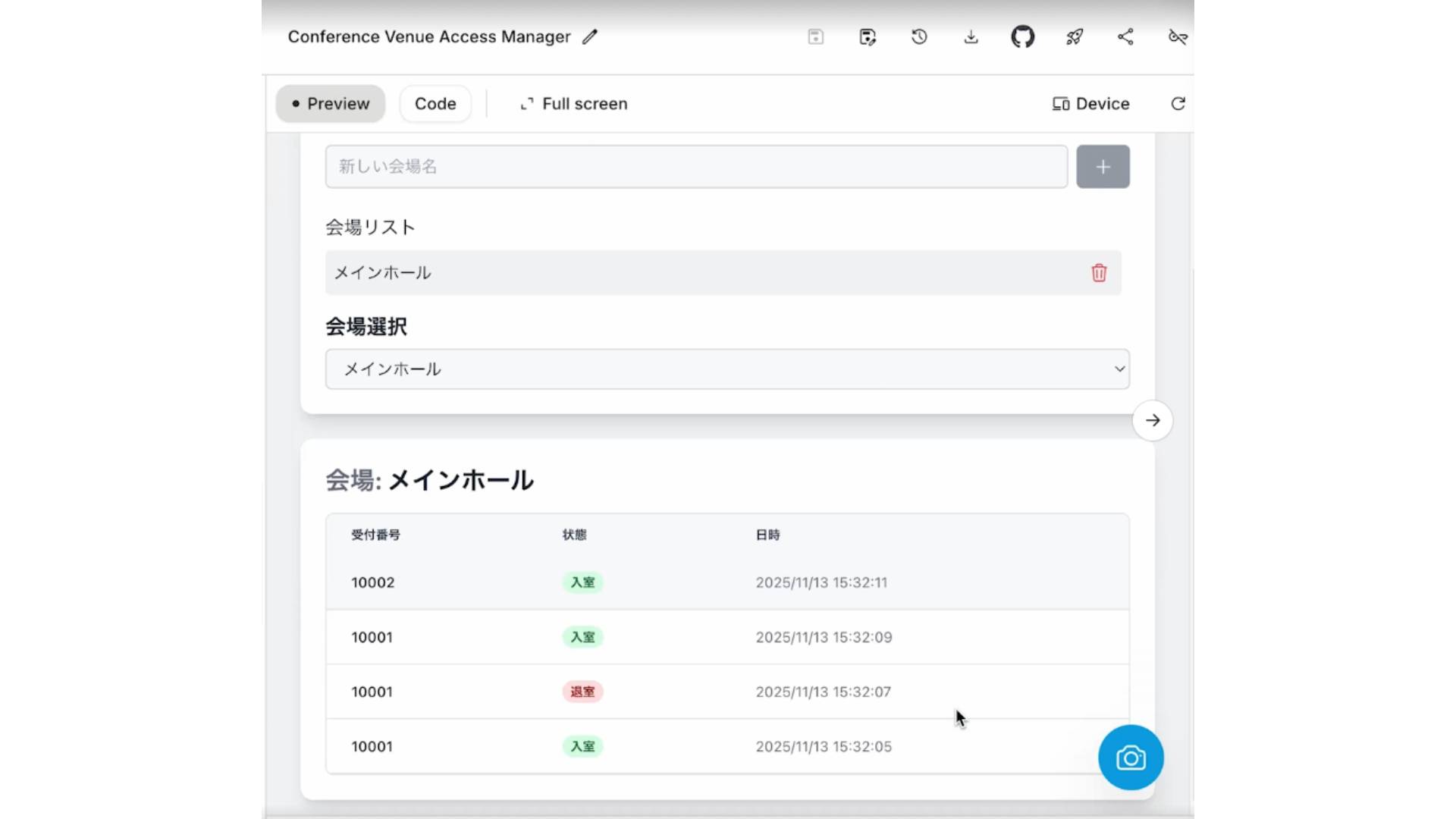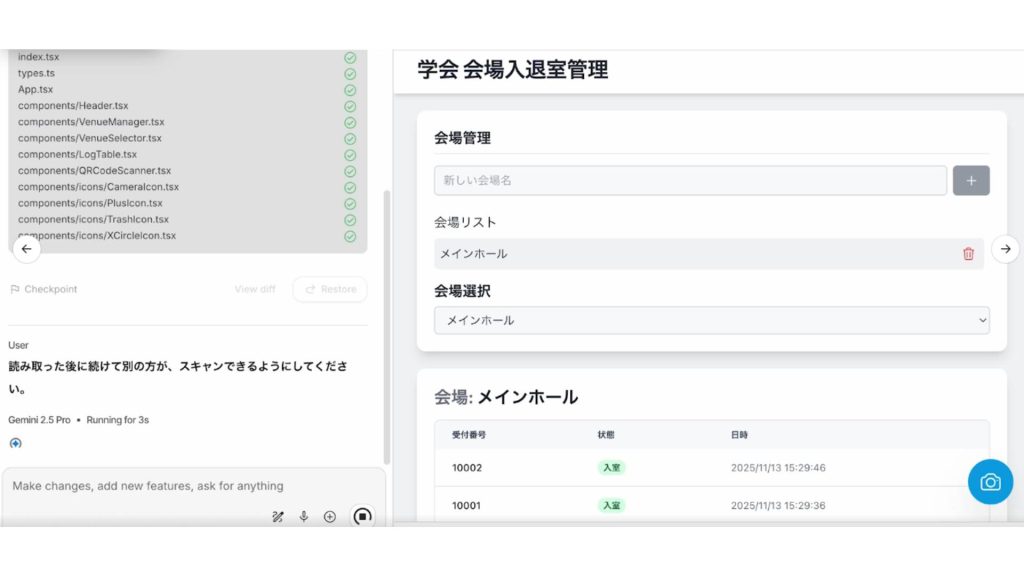 約1分半で初期バージョンが完成しました。会場の登録・選択機能とカメラの起動ボタンが生成されました。しかし、QRコードを読み取るとカメラが消えてしまい、連続してスキャンできない問題がありました。