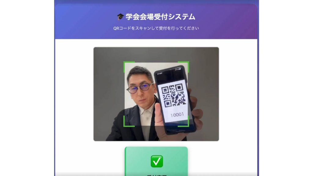 ボタンをクリックすると、ブラウザのカメラへのアクセス許可を求められます。許可した後、QRコードを読み取ると「受付完了」と表示されました。