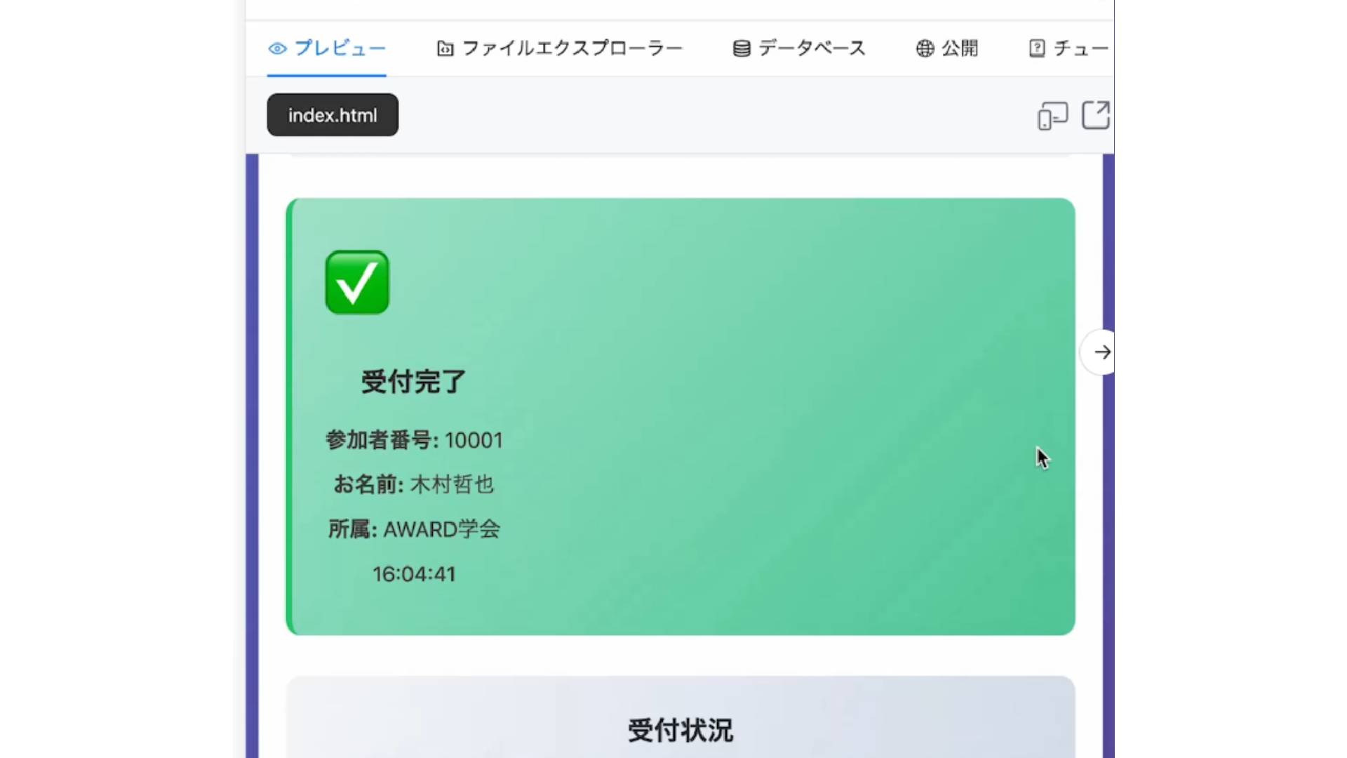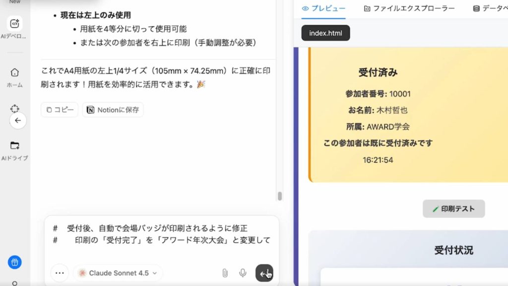 次に、受付結果(可否)が画面上で明確にわかるようにし、さらに受付完了時に参加者の名札(会場バッジ)を印刷する機能を追加するため、以下のプロンプトを入力します。