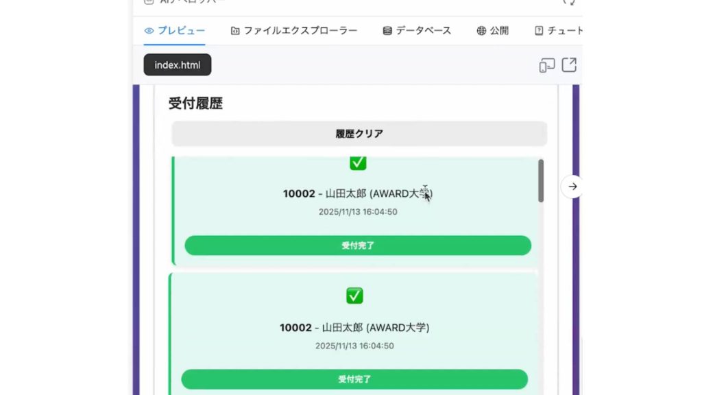 最後に、受付履歴をCSVファイルとして出力する機能を追加するよう指示し、「CSV出力」ボタンを実装しました。これにより、受付日時、状況、参加者情報を一覧で確認・管理できるようになりました。