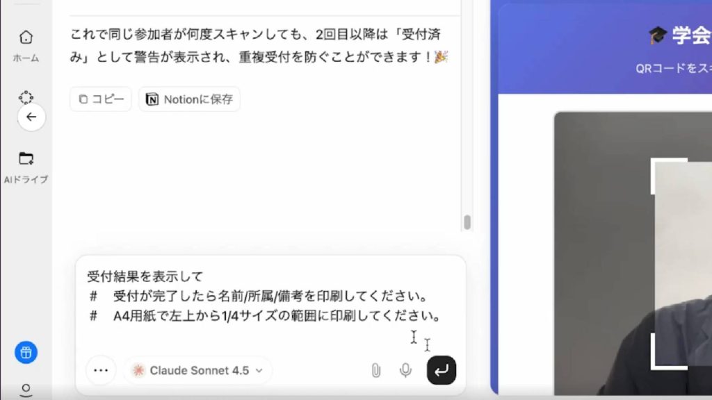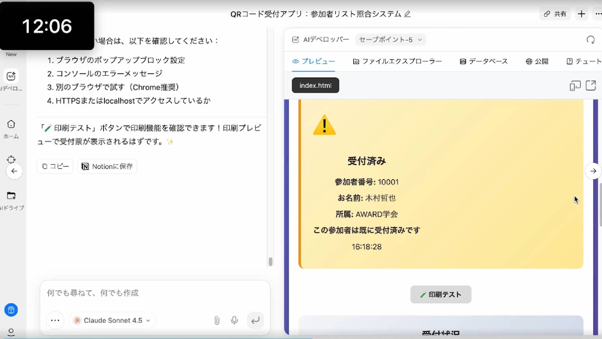 修正後、QRコードをスキャンすると、画面下部に「受付されました」と表示されるようになりました。しかし、自動での印刷は実行されませんでした。AIは自動印刷の代わりに「印刷テスト」ボタンを追加しており、これをクリックすると名札が印刷される仕様になっていました。