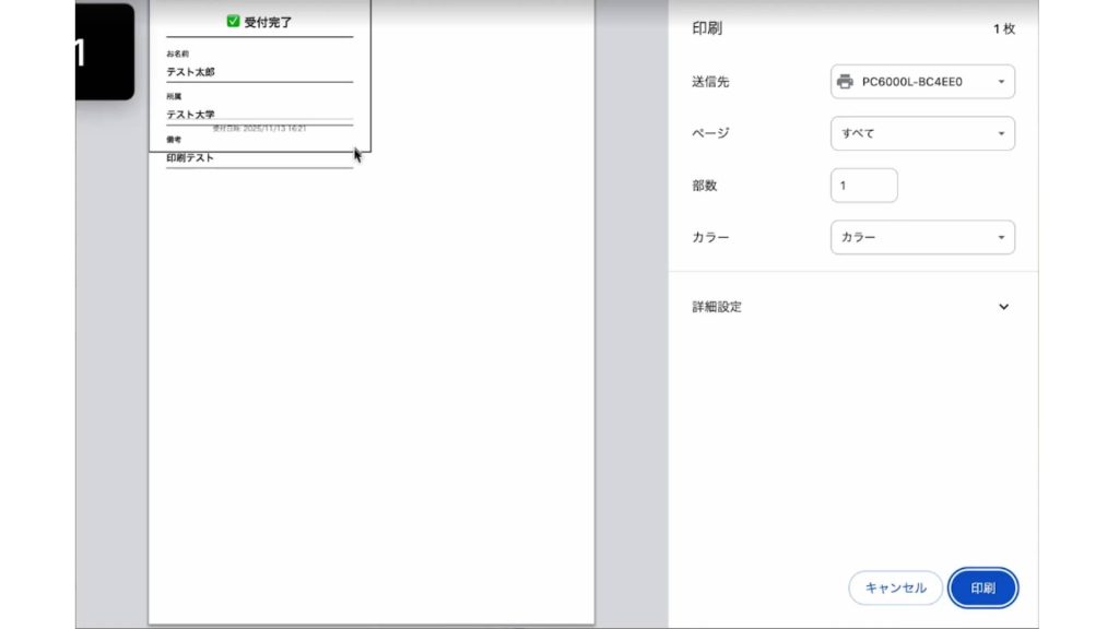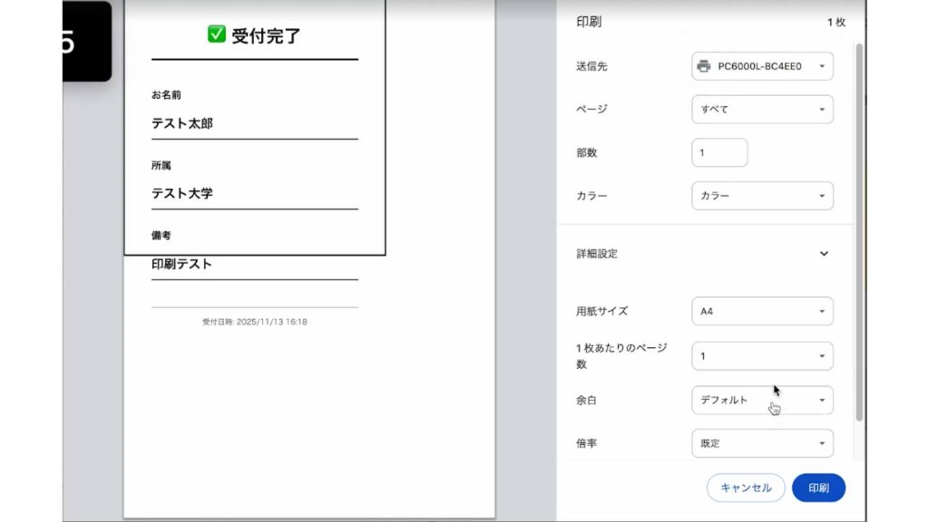 履歴をクリアした後、再度QRコードをスキャンすると、今度は印刷ダイアログが自動で起動しました。ブラウザのセキュリティ仕様上、印刷ボタンのクリックは避けられないものの、受付から印刷までの一連の流れがスムーズになりました。