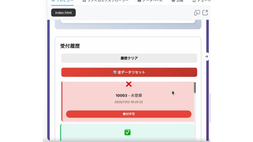 しかし、修正後も自動印刷は実行されませんでした。これは、既に同じQRコードが「受付済み」として記録されているためと考えられます。そこで、受付データをリセットする機能を追加するよう指示しました。