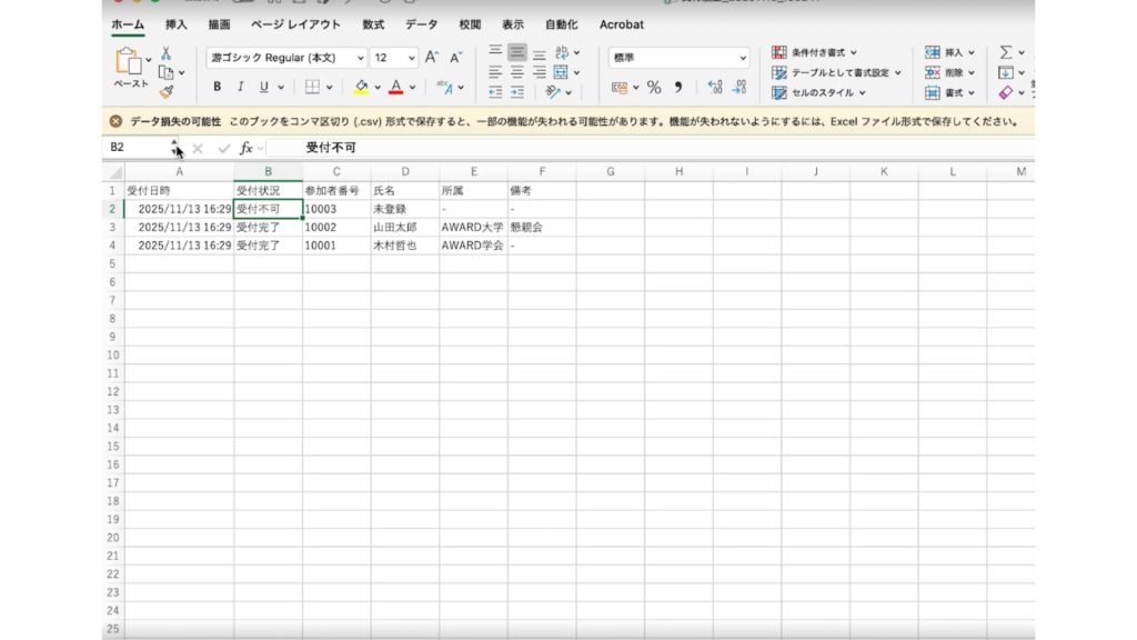 この指示と合わせて、事前に用意した参加者リスト(CSV形式)をアップロードします。このリストには、A列に受付番号、B列に氏名、C列に所属、D列にメモが記載されています。AIは、このCSVデータを参照して受付可否を判断します。