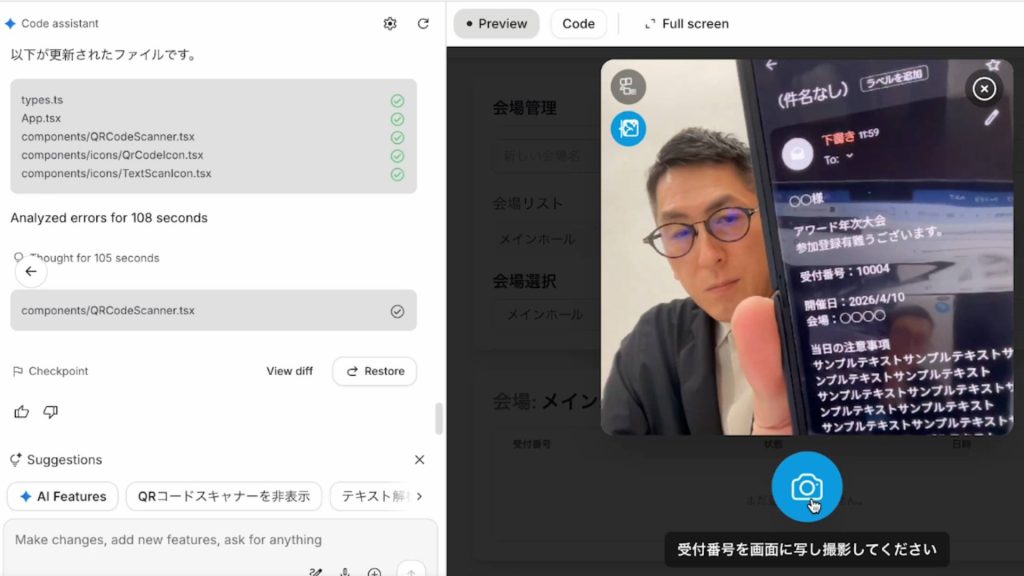 参加者がQRコードを持っていない場合を想定し、受付メールの本文から受付番号を抽出する方法も試しました。プロンプトで「メール本文をスキャンしたテキストから受付番号が抽出できるか」と指示したところ、AIはQRコードスキャンとは別のボタンを実装しました。