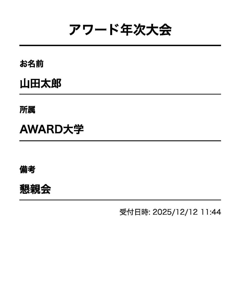「受付結果を表示して。受付が完了したら名前・所属・備考を印刷してください。左上から4分の1サイズの範囲に印刷してください。」