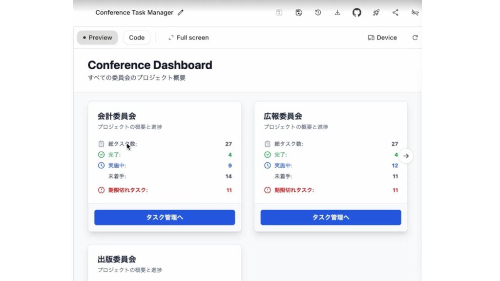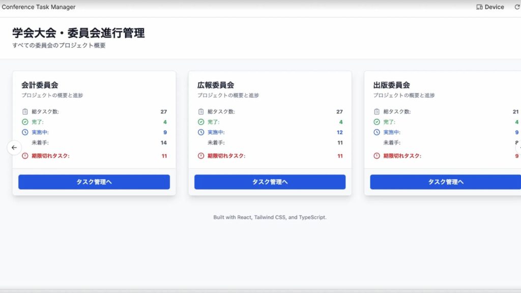 完成したダッシュボードでは、各委員会のタスク状況が一覧表示され、クリックすると詳細なタスク管理画面に遷移します。