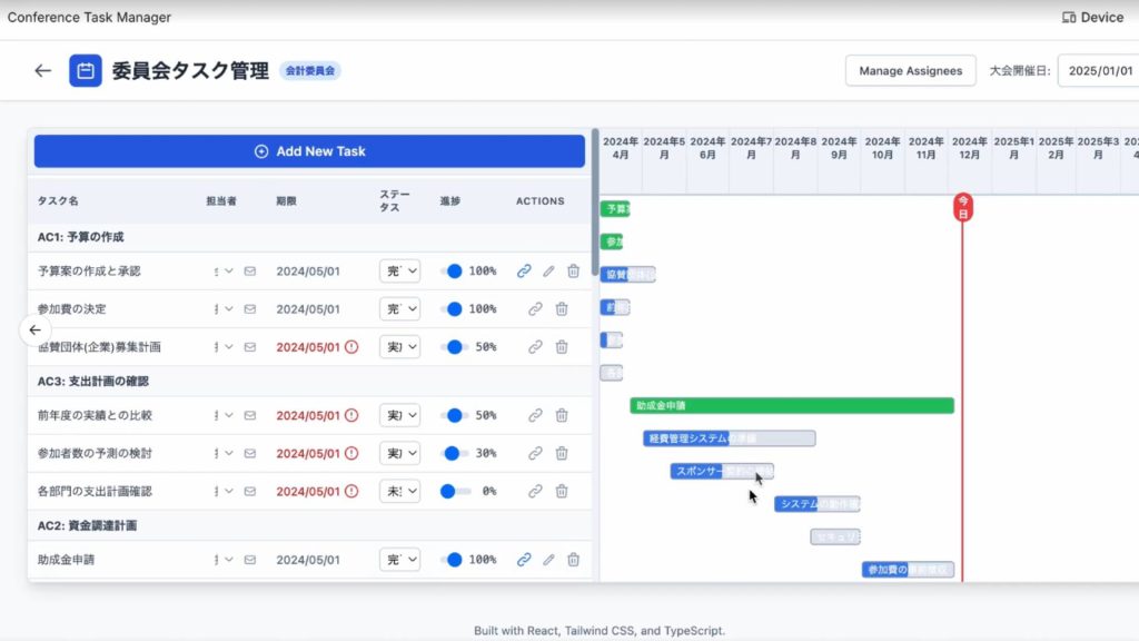 「添付のタスク管理表の項目で管理できるアプリを作成してください。大会開催日を入力することで自動的に期限を設定してください。各タスクのステータスと進捗率を編集できるようにして、各タスクの作業期間のGanttチャートを作成して、各タスクに担当者を設定し、担当者のメールアドレスへメールを送信できるようにして、各タスクの期限が近づいている場合と期限を超えてしまった場合はアラートが出て管理できるようにしてください。」