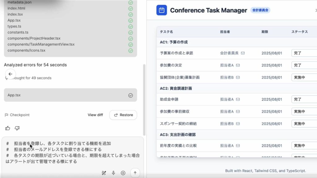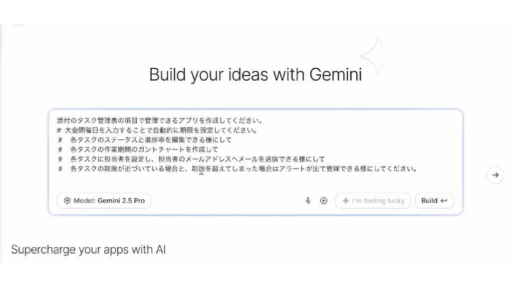 Google AI Studioにログインし、以下のプロンプトとタスク管理表のPDFを添付して構築を開始します。