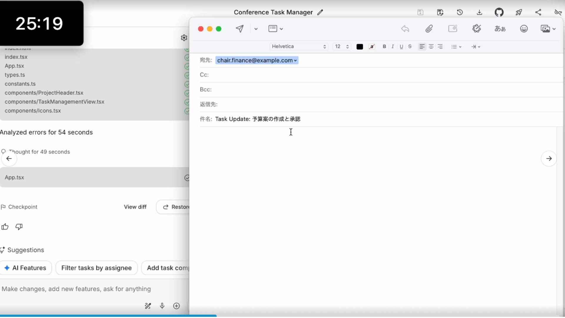 約3分半で初期バージョンが完成しました。タスク内容や期限は反映されていますが、担当者の登録機能がなく、メール本文も空の状態でした。
