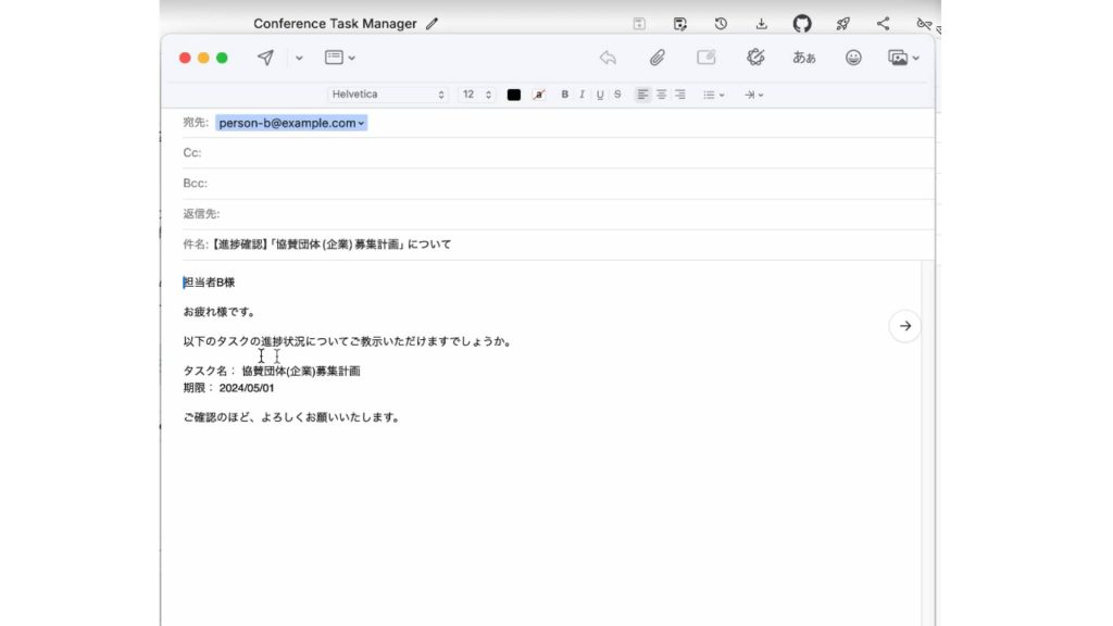 修正後、メール本文が自動生成されるようになりましたが、英語でした。また、タスクの追加・削除ボタン、資料リンクボタンも追加されました。