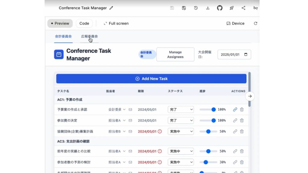 タスクの期限を編集する機能を追加し、他の委員会(広報委員会、出版委員会)のタスク管理もできるように、タブ形式での追加を指示します。